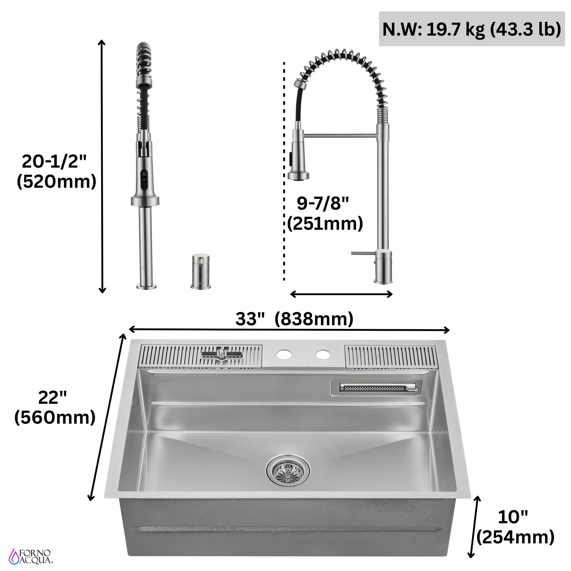 FORNO ACQUA 33 in. Drop-In/Undermount 3-Level Workstation Sink with Faucet, Waterfall & Glass Rinser