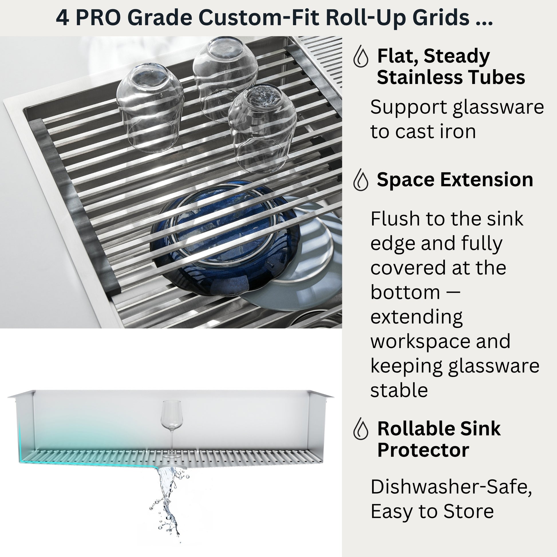 * 4 Flat, Steady Stainless Steel Roll-Up Grids extend workspace & protect sink bottom — Fully Dishwasher-Safe
