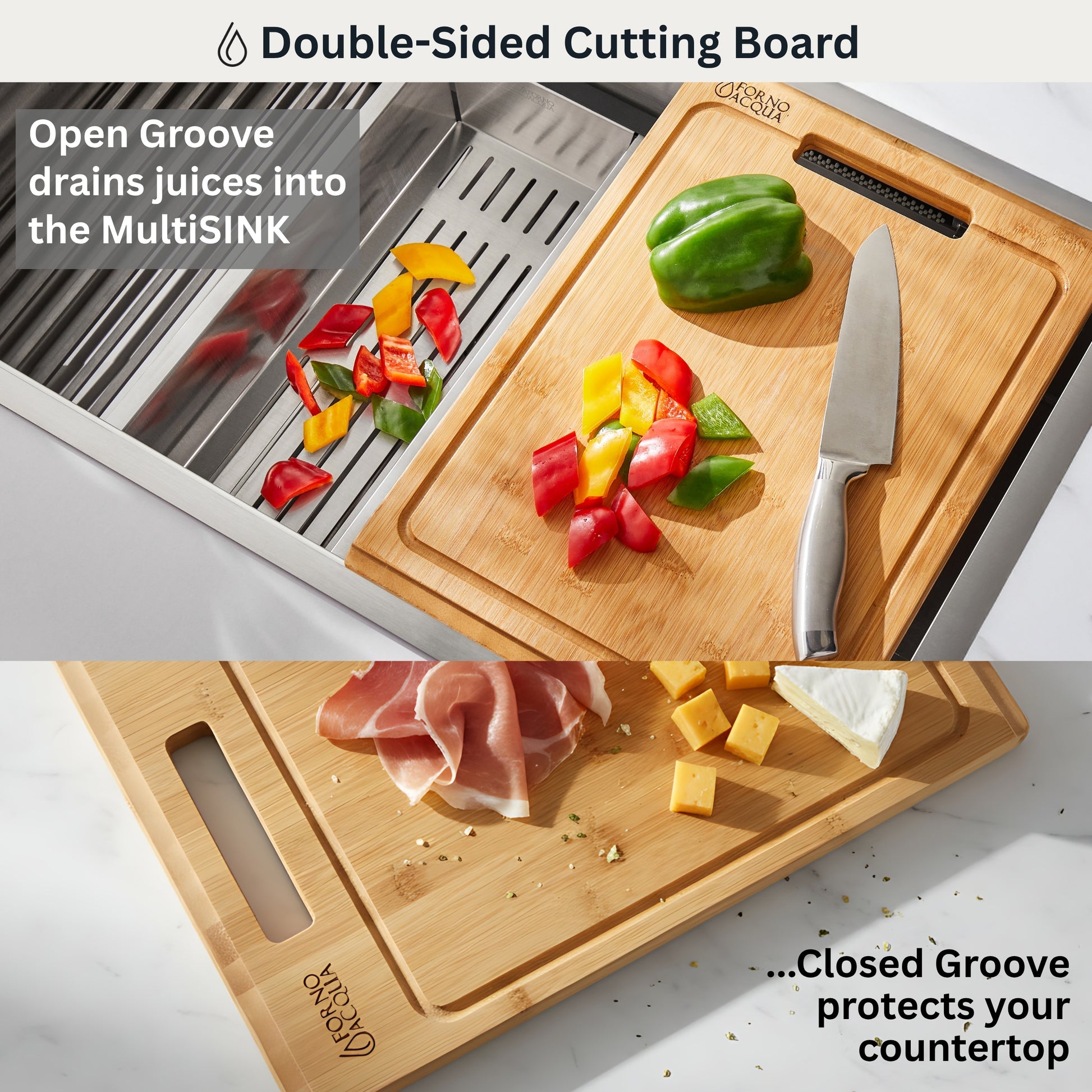 * Double-Sided Cutting Board: Open Groove Drains Juices into MultiSINK, Closed Groove Protects Countertops