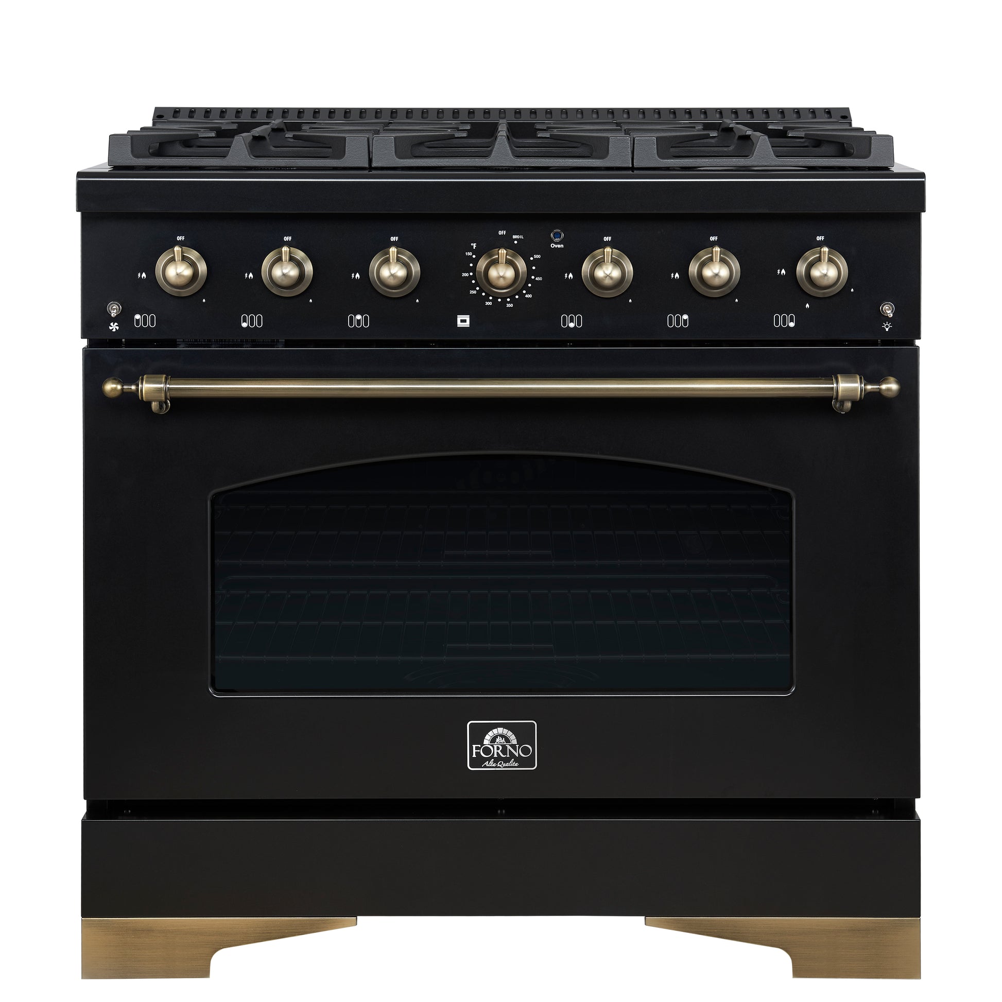 Forno Antico 36-Inch Freestanding Gas Range, Black, Antique Brass Design, 6 Burners, Convection Oven, Energy Efficient