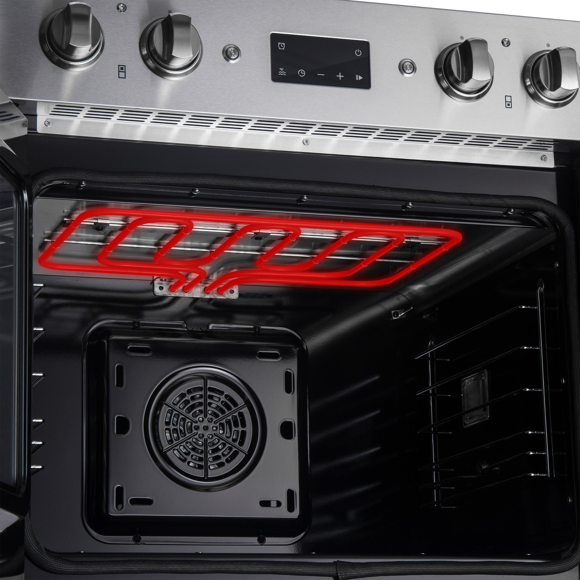 * A sleek stainless steel finish with pro-style handles and durable zinc-coated knobs adds a touch of elegance and durability.