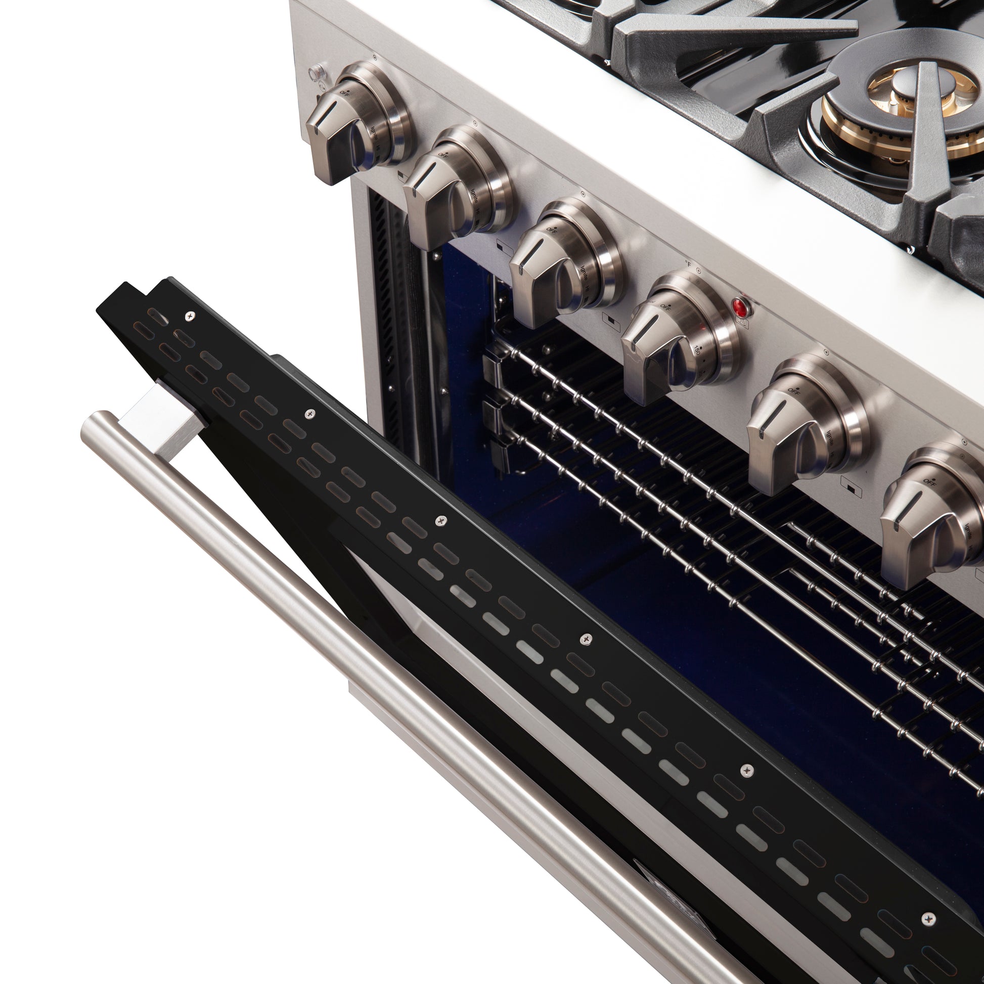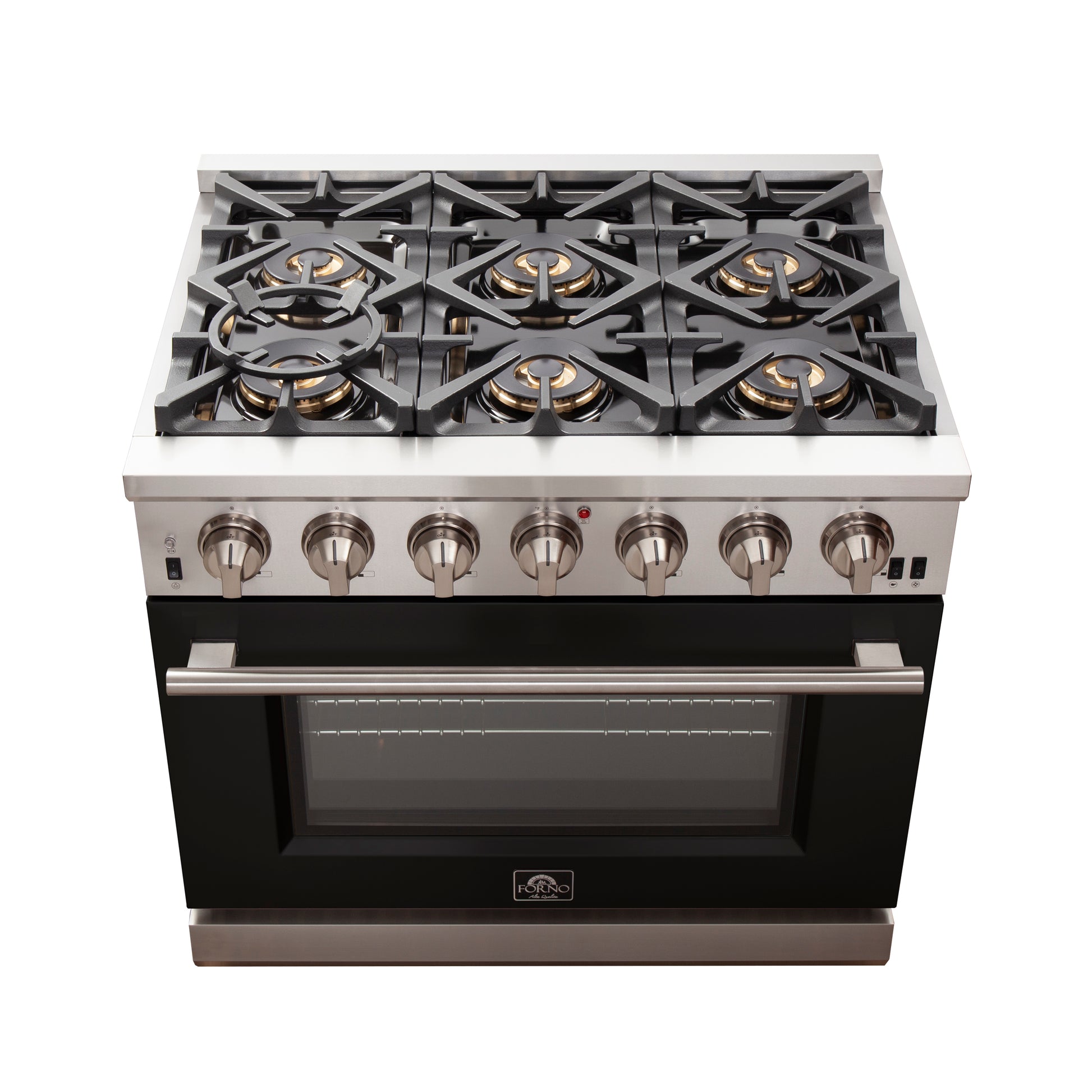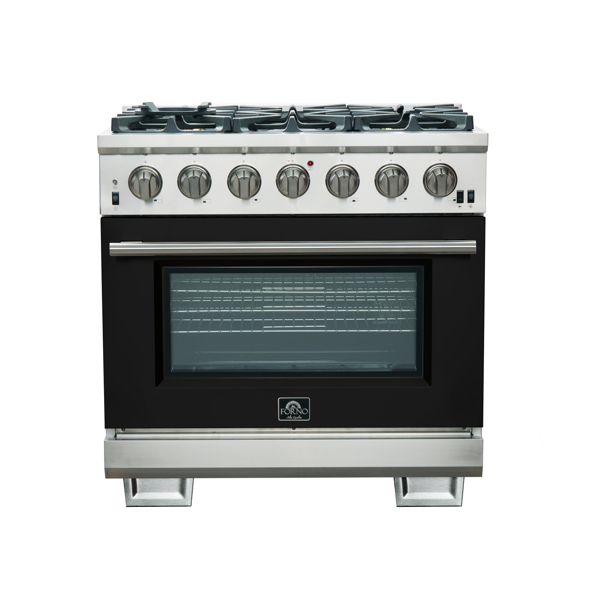 Forno Capriasca 36-Inch Gas Range, Stainless Steel, 6 Brass Burners, 120,000 BTU, Convection Oven, Energy Efficient, Black door