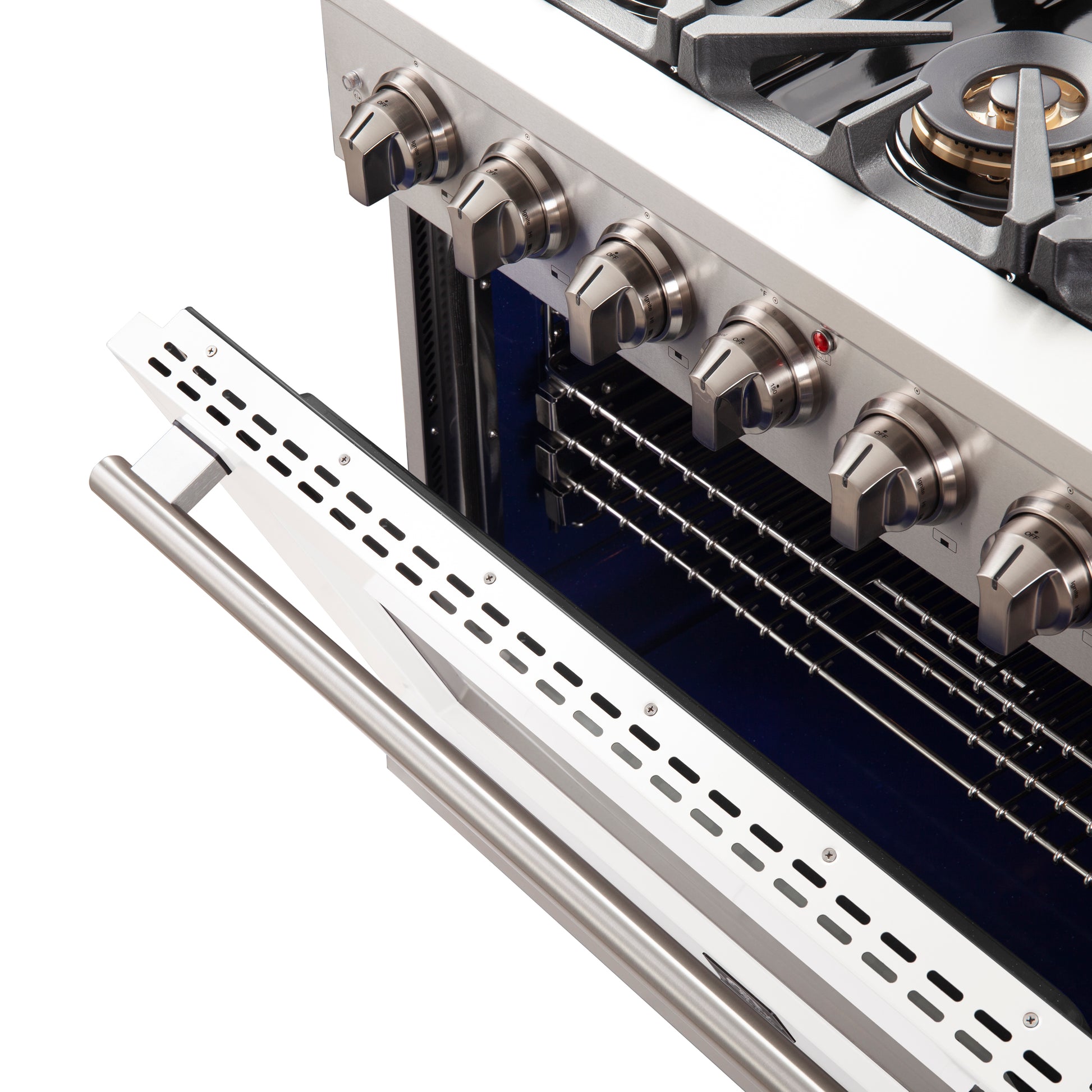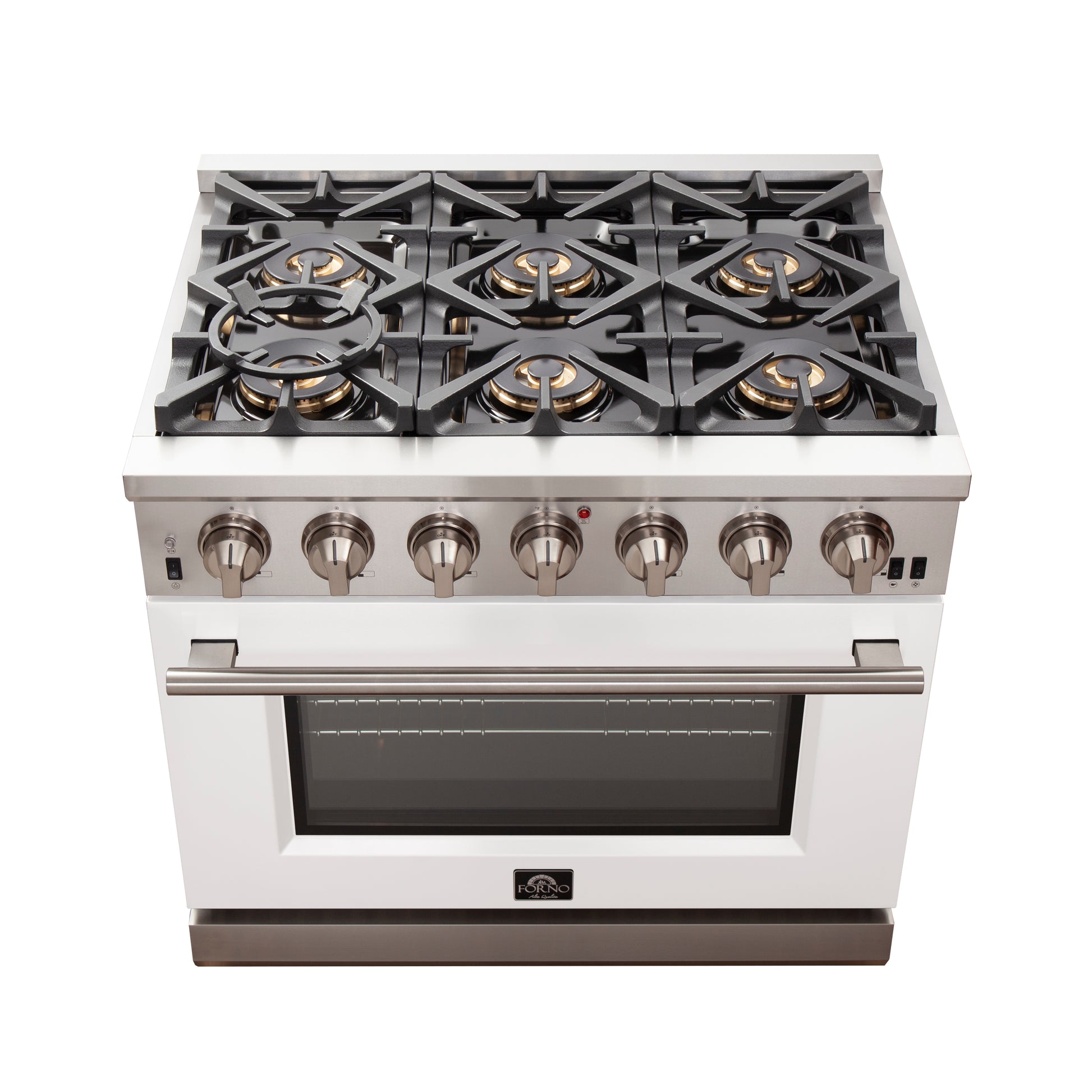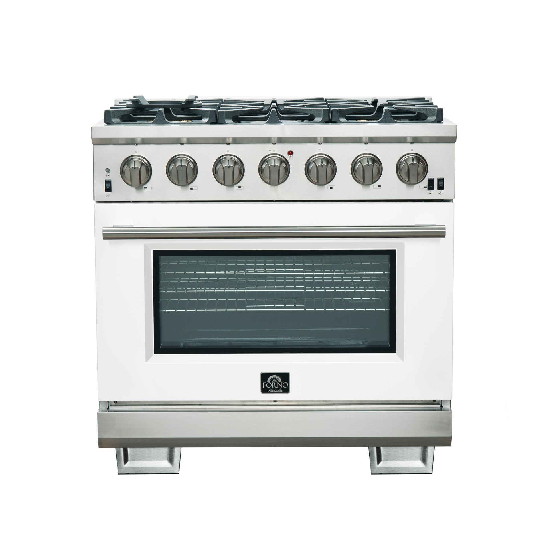 Forno Capriasca 36-Inch Gas Range, Stainless Steel, 6 Brass Burners, 120,000 BTU, Convection Oven, Energy Efficient, White Door