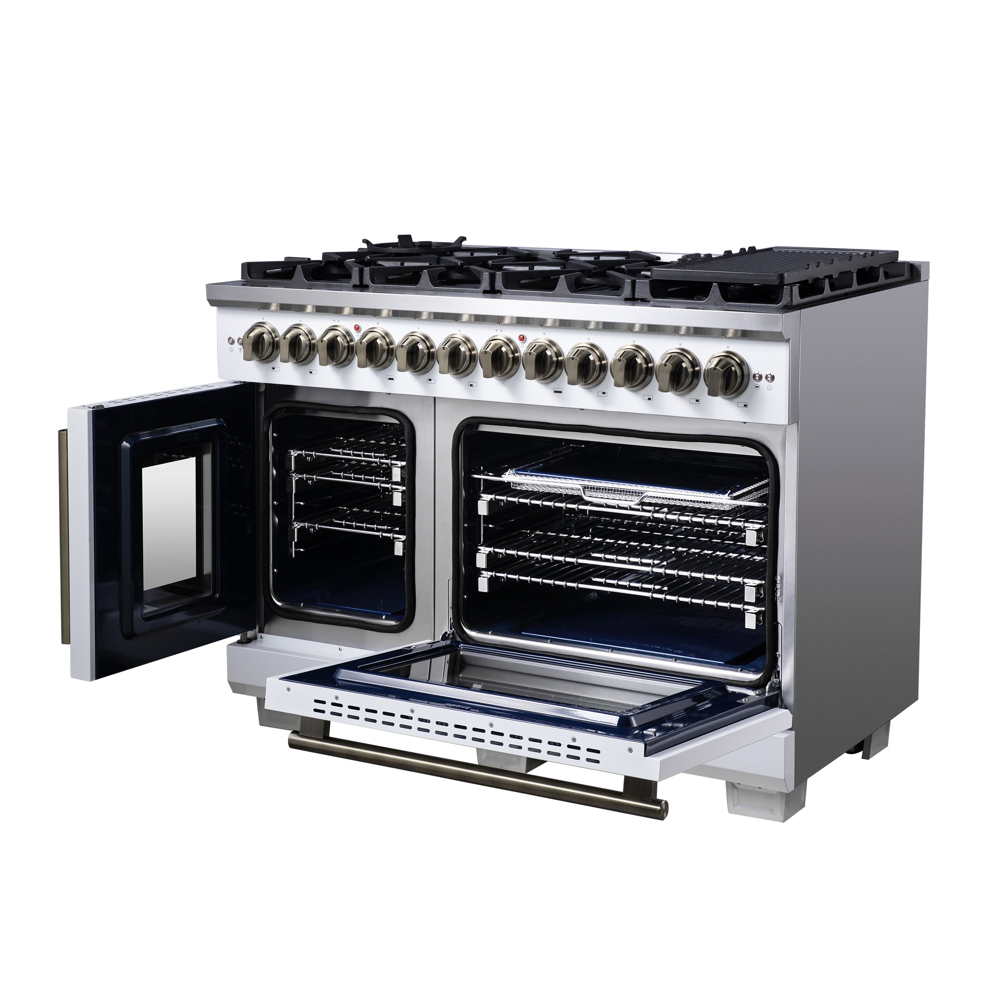 Forno Capriasca 48 Inch Freestanding French Door Dual Fuel Range in White with Antique Brass Accessories, 8 Burners, True Convection Oven