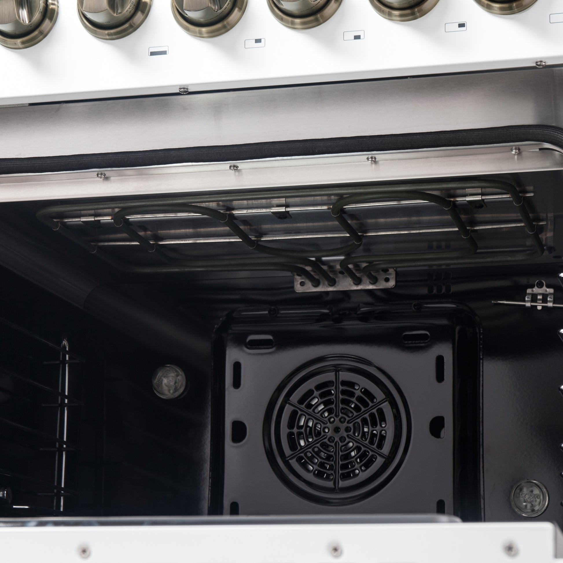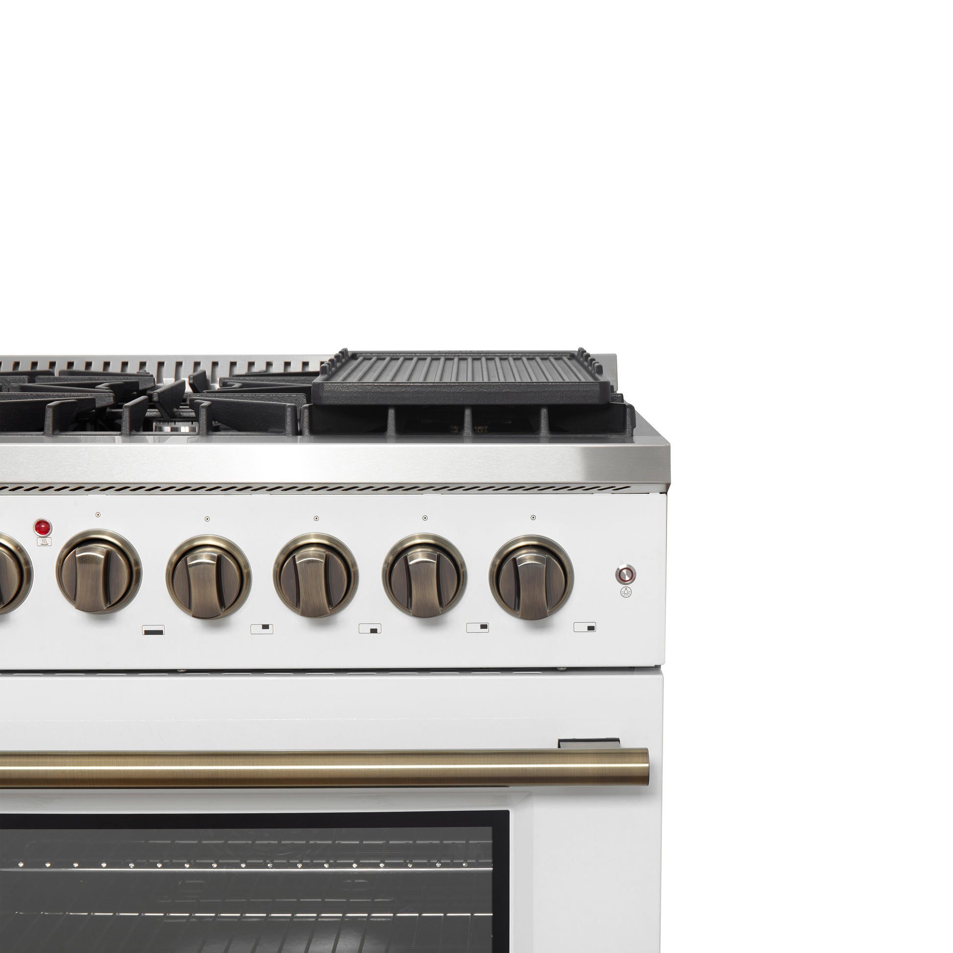 Forno Galiano 48-inch French Door Dual Fuel Range, White & Antique Brass Design, 8 Sealed Burners - 107,000 BTU, Griddle, 6.58 cu.ft. Double Ovens