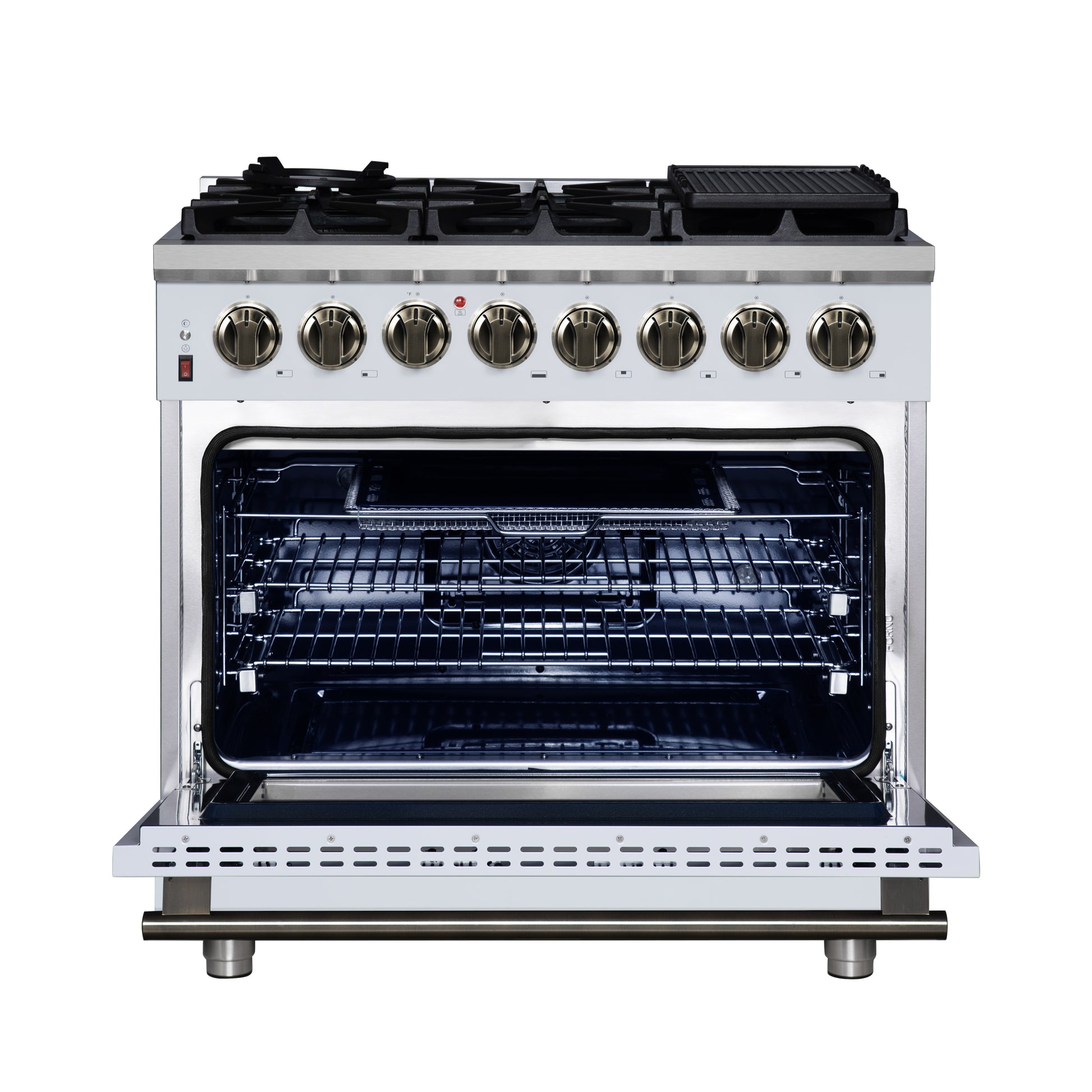 Forno Massimo 36 Inch Freestanding Dual Fuel Range in White with Antique Brass Accessories, 6 Burners, 5.36 cu. ft. Convection Oven