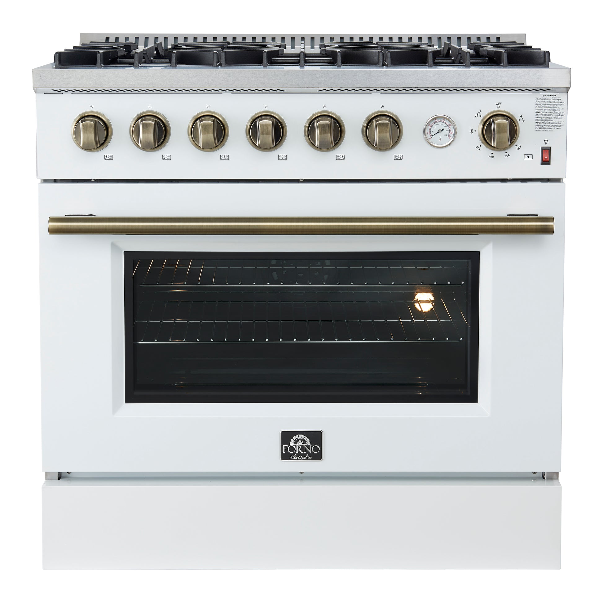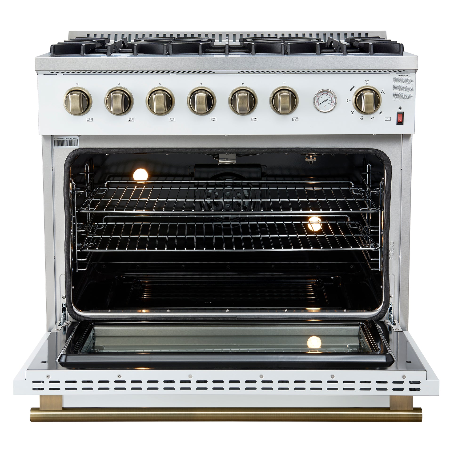 Marco 36-Inch Gas Range White & Antique Brass Design, 6 Burners 67,000 BTU, 5.36 cu.ft. Convection Oven
